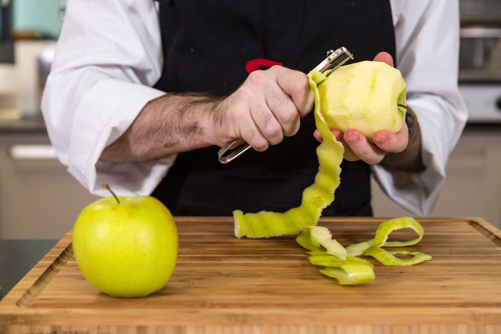 Then cook the apple at 65 oC for an hour. Thanks to the sous-vide, we’ll get apple which is tender but unbroken and flavours and aromas which are much more intense than those achieved through traditional methods. On a floured surface, stretch the puff pastry until it’s as thin as possible and cover one side with the (cold) filling. Fold the pastry over and roll it up.