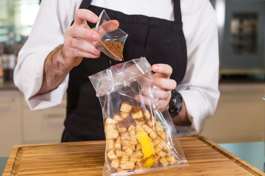 First, peel and chop the apple into 1.5 cm thick pieces and put into the vacuum bag with all the other ingredients, except the raisins which need to be soaked in the rum.