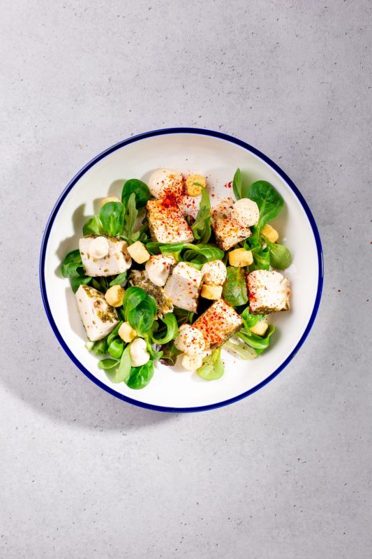 To serve, arrange a lettuce base and put the sliced chicken on top with the croutons and round it off with a healthy dash of sauce.