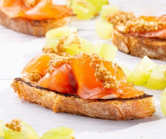 Para acabar, laminamos el salmón con un cuchillo largo y lo acompañamos del pepino y unas tostas.