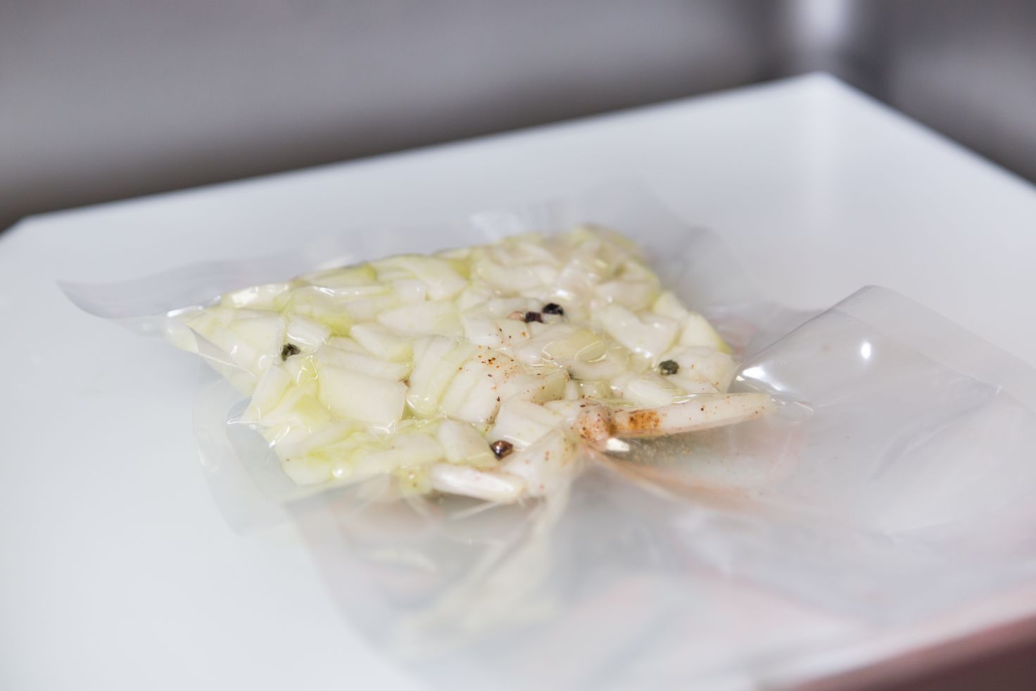 D’abord, on coupe la poire en morceaux et on l’emballe avec le reste des ingrédients. Ensuite, on fait cuire le mélange dans le SmartVide pendant une heure et demie à 80°C. Enfin, on le mixe et on réserve.