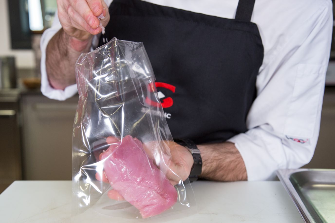 D’abord, on pare bien le filet mignon et on le sale. Après cela, on l’emballe sous-vide et on le fait cuire dans le SmartVide à 59°C pendant 50 minutes, ce qui nous permet ainsi d’atteindre le point de cuisson idéal et la température intérieure souhaitée.