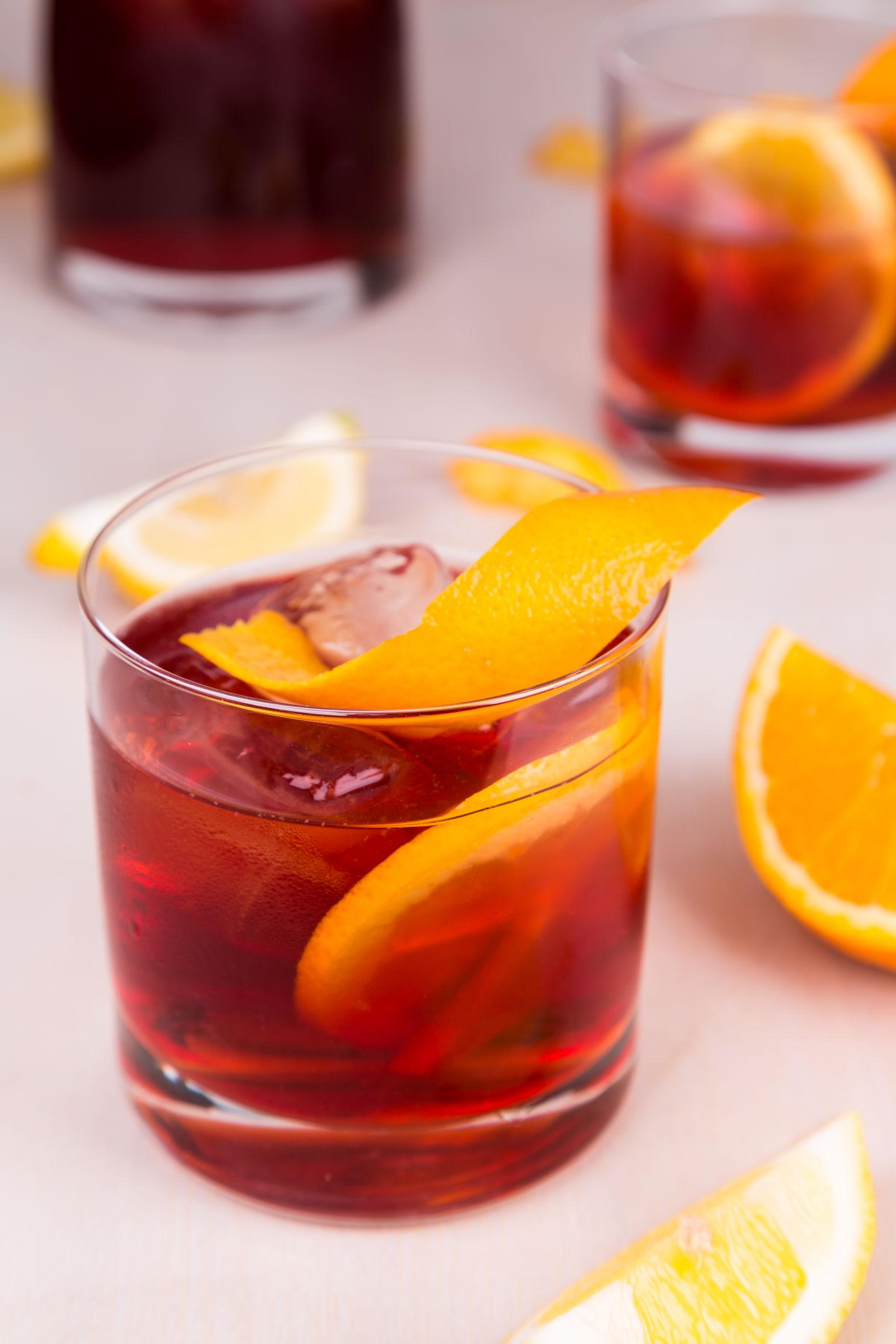 Per servire il cocktail, mettere il composto in un bicchiere largo con ghiaccio e servirlo decorato con una buccia d’arancia.