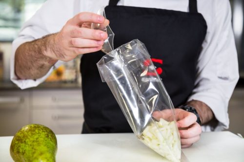 Primeiro, corta-se a pera e mistura-se com o resto dos ingredientes. Depois, cozinha-se a mistura no SmartVide a 80ºC durante uma hora e meia. Para terminar, tritura-se e reserva-se.