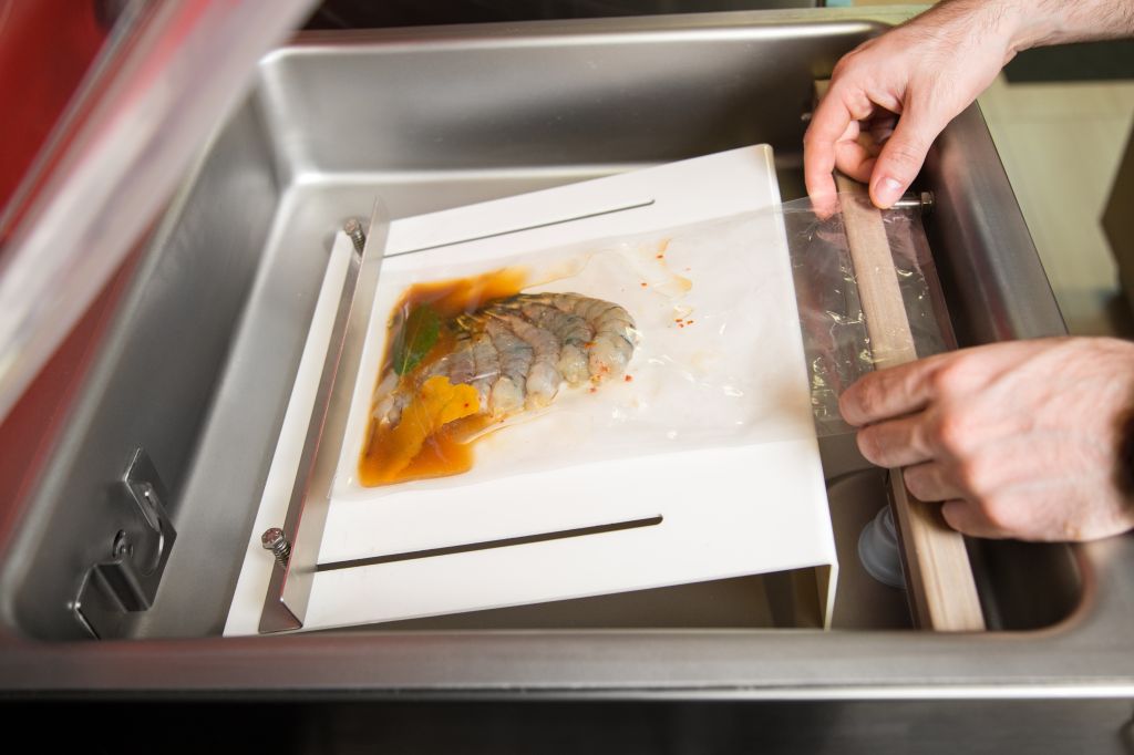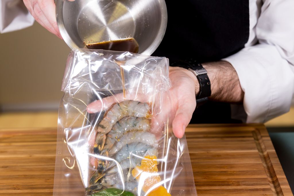 Nesta receta, graças à utilização do sous-vide, a marinada dos camarões é feita mais rapidamente e, por isso, obtemos mais sabor destes. Além disso, esta técnica permite-nos ter uma cozedura perfeita e igual em todos os camarões. E, além disso, se utilizarmos esta técnica para fazer conserva, aceleramos o processo, dado que a conserva penetra antes no produto graças ao vácuo.