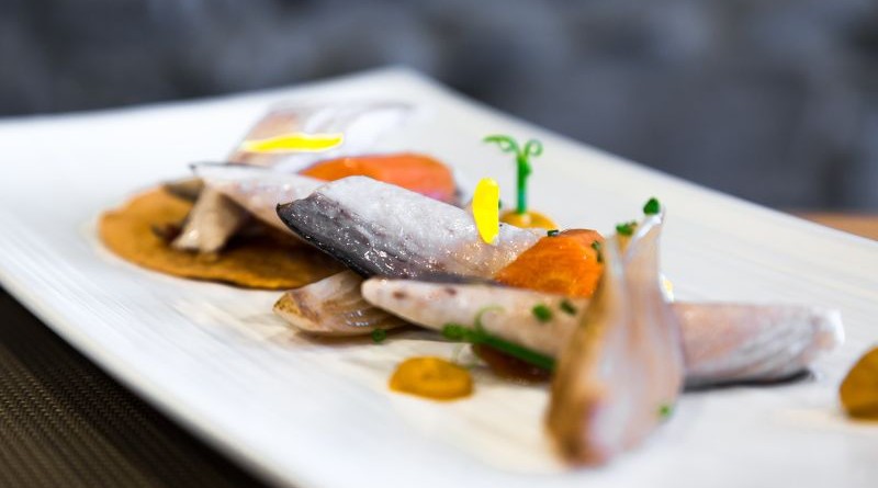 Fillet the mackerel, remove the spine and cut into slices around 5 cm thick. Place in a bag seasoned with the bay leaf, oil, vinegar, wine and pepper and cook at 65º for 7 min.